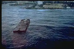 Eight days after the spill on January 15, the barge was towed to an area 37 km Northeast of San Juan and intentionally sunk under government supervision to a depth of 2 km in an underwater canyon, where it is still located today.[3][8] This decision was ultimately made after it was determined that transporting the remaining oil off of the barge would not be feasible.[2] The barge was sunk at an isolated site that does not experience much ship traffic to avoid further damage. The cleaning of the majority of the oil was completed by April 1994. The cost of the cleanup amounted to approximately $130 million.[2]