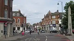 Mortlake is mostly a residential commuter town with a strong history of self-employed trades as it has traditionally centred its commerce on its foreshortened boundary, the Upper Richmond Road, arguably half part of East Sheen. Some businesses on the north side of the Upper Richmond Road make reference to the old ecclesiastical and ward boundaries supported by their still Mortlake side streets.[20] East Sheen was once a manor in the parish of Mortlake and since early times an economic forum, and now a dining and convenience hub of the two districts. The Victoria County History's volume on Surrey, written from 1910 to 1912, does not list East Sheen as a parish, describes its detailed history under Mortlake and states the parish was "now connected with Barnes on one side and with New Richmond on the other".[10][21] With the advent of motor transport, the buildings on Mortlake's winding high street, also known as the Lower Mortlake Road, have been mostly residential or used by the brewery.