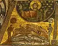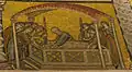 | Pharaoh's Dreams | It differs from the preceding scenes by a richer palette of colours, though this could be due to a different mosaicist, whilst its lively composition in almost pathetic tones may attribute them to the Master of the Maddalena (Pesenti, 1978–1979). The curtain over Pharaoh's bed is a late 19th-century restoration. | |
