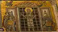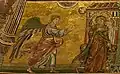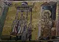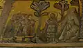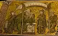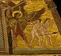 The last part of the interior to have mosaics added were the women's galleries between approximately 1300 and 1330.[1] These show angels and saints and their style agrees with Giovanni Villani's written evidence, which dates their completion to 1330 and probably dates the start of work to around 1300–1315. There are no art historical studies specifically on the mosaics of the women's galleries, though Venturi briefly notes that they were produced after 1300. The vault has a central motif of a starry sky, symbolic of the Empyrean, surrounded by angels with unclear attributes, possibly another set of angelic hierarchies.