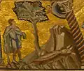| Joseph Interpreting Pharaoh's Dream | It differs from the preceding scenes by a richer palette of colours, though this could be due to a different mosaicist, whilst its lively composition in almost pathetic tones may attribute them to the Master of the Maddalena (Pesenti, 1978–1979). No substantial restorations. | |