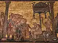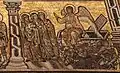 Noah and the Animals Enter the Ark | Double scene, showing a certain modernity in the animals. Ponticelli attributed it to a 1483–1499 intervention by Alesso Baldovinetti, inspired by Paolo Uccello's frescoes Scenes from the Life of Noah in the Chiostro Verde of Santa Maria Novella. Roberto Longhi instead argued the mosaic was earlier than the fresco, with the latter drawing on the former. Soulier noted Egyptian or Syriac influence. |