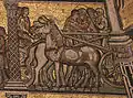 | Joseph Given Command over Egypt | It differs from the preceding scenes by a richer palette of colours, though this could be due to a different mosaicist, whilst its lively composition in almost pathetic tones may attribute them to the Master of the Maddalena (Pesenti, 1978–1979). | |