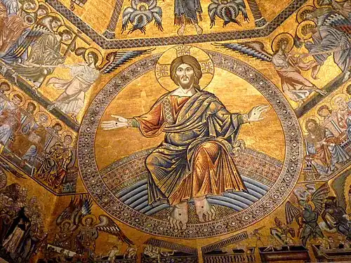 According to Vasari the earliest mosaics was by Andrea Tafi, a semi-legendary figure, who produced the angelic hierarchies and the Pantocrator assisted by Apollonio, a Greek he had met in Venice. He attributed the rest of the work to Gaddo Gaddi. It is impossible to confirm Vasari's account, though the earliest mosaics are also the most similar to those in San Marco Basilica, Santa Maria Assunta Basilica, other Venetian locations and Rome's San Paolo fuori le Mura, where the Venetian masters also worked after being summoned by Pope Honorius III in 1218.[2]