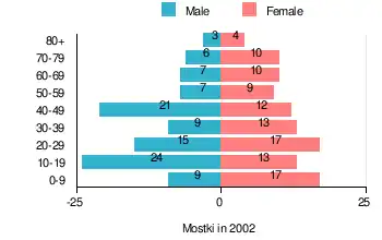 According to the 2002 Poland census, there were 206 people residing in Mostki village, of whom 49% were male and 51% were female. In the village, the population was spread out, with 25.7% under the age of 18, 39.3% from 18 to 44, 17.5% from 45 to 64, and 17.5% who were 65 years of age or older.[1]