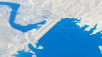 The earthen embankment dam is located on top of gypsum, a soft mineral that dissolves in contact with water. Continuous maintenance is required to plug, or "grout", new leaks with a liquefied slurry of cement and other additives.[19] More than 50,000 tonnes (49,000 long tons; 55,000 short tons) of material have been injected into the dam since leaks began forming shortly after the reservoir was filled in 1986, and 24 machines currently continuously pump grout into the dam base. Between 1992 and 1998 four sinkholes formed downstream of the dam and a fifth sinkhole developed east of the dam in February 2003 that was filled several times. In August 2005 another sinkhole developed to the east.[12]