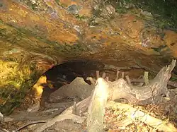 Mother Ludlam's Cave, also known as Mother Ludlum's Cave or Mother Ludlum's Hole, is a small cave in the sandstone cliff of the Wey Valley at Moor Park, near Farnham, Surrey, in England. The cave is the subject of a number of local legends. A spring rising in the cave is recorded in the 13th century "Annals of Waverley Abbey" as "Ludewell"; other spellings through history include "Ludwell" and "Luddwelle". A monk named Symon is credited with identifying the spring as a suitable water supply for Waverley Abbey in 1218, after the original source had dried up.[1] The brothers of the abbey dedicated the spring to St Mary, so it also became known as St Mary's Well. The cave has been naturally formed by the spring but may have been enlarged by the monks and was made into a grotto (possibly during the eighteenth century) and further enhanced by addition of an ironstone arched entrance, possibly during the reign of Queen Victoria.