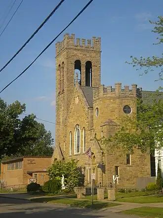 The Mass was first celebrated in Ashtabula Harbor in 1878, during the summer only in the early years; the first place of worship was a grocery store. Out of this gathering, a parish was established in 1890 and dedicated to St. Mary under her title of "Mother of Sorrows".[2] Constructed in 1898 in the Romanesque Revival style of architecture,[1] the church was designed by William P. Ginther, an Akron-based architect who specialized in ecclesiastical architecture.[3] Both the foundation and the walls are sandstone, the roof is asphalt, and glass forms a significant part of the exterior.[1] The church occupies a corner lot, and large gables with massive windows face both streets. A square tower with battlements is placed at the corner facing the intersection; the main entrance is set in the tower's base, and a belfry occupies the top third of the tower.[4]