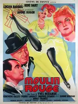 Moulin Rouge is a 1941 French musical comedy film directed by André Hugon and Yves Mirande and starring Lucien Baroux, René Dary and Annie France.[1][2] The film's sets were designed by the art directors Lucien Jaquelux and Hugues Laurent.[3]