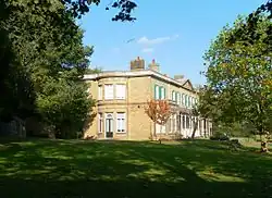 Moulsecoomb Place is the only building in the Moulsecoomb area mentioned by Ian Nairn and Nikolaus Pevsner in the Sussex edition of their Buildings of England architectural guides. They describe it as "an early 19th-century seven-bay house of yellow brick", and note that the hall house attached to the rear is "the only worthwhile timber-framed cottage in Brighton".[14] The seven-bay façade, which faces east,[7] is the original part dating from 1790; another two-window range was added on the south side in the early 20th century,[2] making the composition asymmetrical. The original section has yellow brickwork in a Flemish bond pattern to the main elevation and brown and yellow gauged brickwork on the north (side) wall. Yellow bricks are also used on the south extension, but in a stretcher bond layout.[7] The 1790 section has a 2–3–2 bay pattern whose central three-bay section projects slightly and is set beneath a pediment.[2][7] Its tympanum has a pattern of raised brickwork. Behind the pediment is a parapet and a cornice with mutules below. Some of the ground-floor windows have elements of the Palladian and Neoclassical Adam styles; those at first-floor level are straight-headed. The hipped roof has several chimney-stacks.[7] The early 20th-century extension is in complementary style. On the east elevation, a single-storey two-window section projects forward and is topped with a parapet and cornice. This continues round to the south elevation, which has a full-height bow front with a three-window range.[2][7] A modern conservatory has been added to one side.[2]