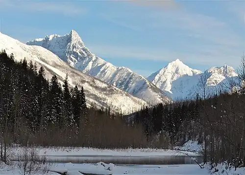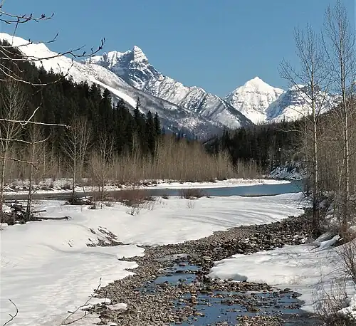 Mt. Doody (left of center), Battlement Mountain (right) from Middle Fork Flathead River