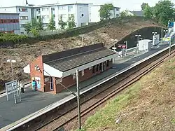 Train services were electrified in May 1962, using overhead lines carrying 25 kV AC south of there and 6.25 kV to the north (due to clearance issues - the system was upgraded to 25 kV throughout in 1973). During the upgrade work, a grade separated junction was installed south of here to reduce conflicting moves between Circle line trains towards Cathcart and those heading for Kirkhill. The island platform layout here allows easy and convenient cross-platform interchange between the two branches to Neilston and Newton and Circle line trains.