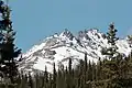 Mount Healy, also known in Denaʼina language as Dlel Neelghu Nodaadlghunee (meaning "mountains that are joined together"), is a 5,716-foot (1,742 meter) elevation mountain summit located in the Alaska Range, in Denali National Park and Preserve, in Alaska, United States.[2][3] It is situated immediately northwest of park headquarters and six miles (9.7 km) south of Healy. The George Parks Highway and Alaska Railroad traverse the eastern base of this mountain as each passes through the Nenana River Gorge. Mount Healy's nearest neighbor, Sugar Loaf Mountain, is set 5.2 miles (8.4 km) to the east across the gorge, and the nearest higher peak is Fang Mountain, 16.2 mi (26 km) to the south-southwest.[1] Mount Healy is a nine-mile-long, east–west trending ridge system of mostly loose rock with jagged peaks and spires. Vegetation ranges from boreal forest at the base all the way up to barren alpine ridges and snowfields at the top. This area is very popular for day hikes due to its close proximity to the park entrance.[4] This mountain and the town are named after John J. Healy (1840–1908), manager of the North American Trading and Transportation Company. This geographical feature's name was reported in 1921 by Mabry Abbey on his survey map of the boundaries of Mount McKinley National Park.[5]