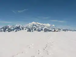 In 1922, a geologist approached the Alpine Club of Canada with the suggestion that the club send a team to the mountain to reach the summit for the first time. An international team of Canadian, British and American climbers was assembled the following year, initially planning an attempt in 1924 but forced by funding and preparation delays to postpone the trip until 1925. The international team of climbers began their journey in early May, crossing the mainland from the Pacific coast by train. They then walked the remaining 200 km (120 mi) to within 10 km (6.2 mi) of the Logan Glacier where they established base camp. In the early evening of June 23, 1925, Albert H. MacCarthy (leader), H.F. Lambart, Allen Carpé, Norman H. Read, W.W. Foster, and Andy Taylor stood on top of the summit for the first time.[30][31] It had taken them 65 days to approach the mountain from the nearest town (McCarthy across the border in Alaska), reach the summit, and return, with all climbers intact, although some of them suffered severe frostbite.[32]
