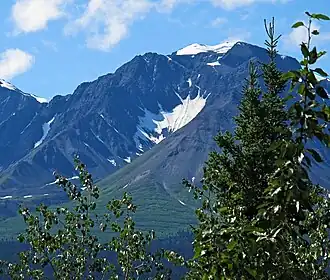Mount Martha Black, elevation 2,512-metre (8,241-foot), is the highest point in the Auriol Range of the Saint Elias Mountains in Yukon, Canada.[1] The multi-summit massif is situated 11 km (7 mi) southwest of Haines Junction, 16 km (10 mi) northwest of Mount Worthington, and 18.6 km (12 mi) southeast of Mount Archibald, which is the nearest higher peak.[3] Set within Kluane National Park, Mount Martha Black can be seen from the Alaska Highway, weather permitting. The mountain was named after Martha Black (1866-1957), the second woman elected to the House of Commons of Canada.[4] The mountain's name was officially adopted August 12, 1980, by the Geographical Names Board of Canada.