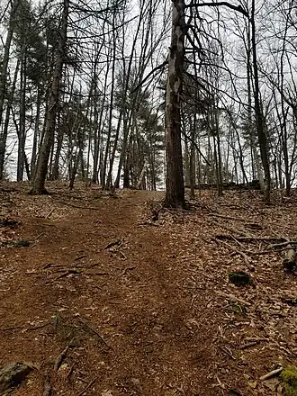 Although it is unknown for certain, Mount Misery may take its name from the death of a pair of oxen or a sheep on the hill in colonial times. By 1667, the Billings family owned land around Beaver Dam Brook and eventually operated a saw mill on the brook, just below what is now the upper pond at the base of Mount Misery. Evidence of this mill remains today near the brook. Concord writer Henry David Thoreau often hiked and recorded his experiences on the hill in his journal in the 1850s.[2] In the 1940s, James DeNormandie acquired much of the land around Mount Misery to prevent it from being developed and for his own agriculture uses. He dammed the brook and excavated soil to form the lower pond, as well as re-damming the original upper mill pond, and he built a cabin on the top of Mount Misery which later burned. DeNormandie sold Mount Misery to the town as public conservation land in 1969.[3] The land contains Beaver Dam Brook, which is still home to several beavers, and Terrapin Lake, a kettle hole, where cranberries were grown until the 1990s.[4]