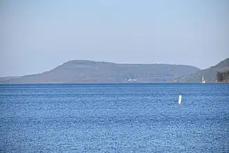 Mount Wellington is a mountain located in the Central New York Region of New York. It is located south of the Hamlet of Springfield Center at the northern end of Otsego Lake. Mount Wellington rises 600 feet (180 m) above lake level. The extreme southern point of the mountain is called Clarke Point and also referred to as the Shad Cam.[2] It is known as "The Sleeping Lion", as it looks similar to a lion laying down, viewed from Cooperstown, New York. It was originally named Mount Millington, but was renamed by George Hyde Clarke in honor of Field Marshal The 1st Duke of Wellington, the victor of Waterloo, who had been Clarke's schoolmate at Eton College in England.[3][4]