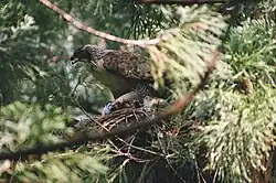 As is typical of accipitrids, the female takes by far the primary role in brooding and protecting the young, while the male makes prey deliveries into the nest or the nearby nest vicinity. Reportedly, the female is very aggressive if nest is disturbed but male is less so or not at all. The aggressiveness of the female may rival that of the often co-occurring spot-bellied eagle-owl and even outrival the defensive attacks on human by the more powerful African crowned eagle.[22][90] Cousins such as the Legge's and changeable hawk-eagle do not typically display any aggression or, if so, are very mild in protective behaviour towards humans while nesting.[12] Apparently, wood-cutters in particular often attract the ire of the female mountain hawk-eagle.[12] Unlike attacks on humans by crowned eagles and northern goshawks, the attack of mountain hawk-eagle is unlikely to be deterred either by traveling in parties or counterattack. Even when struck with branches, machetes or fist and hit with buckshot by humans, apparently the female will still not cease her attack unless killed or grievously injured.[12][91][92][93] In one case, a local woman in the Kumaon division of northern India fell victim to a "particularly savage" attack by a female mountain hawk-eagle and subsequently died from the injuries sustained.[12] Cases have been observed in north India where rhesus macaques, northern plains gray langurs (Semnopithecus entellus) and yellow-throated martens, all known nest predators, have been driven off by the female hawk-eagle, in the case of the marten while repeatedly raking the back as it ran off.[12] The males may make up to two prey deliveries each day but in the area of nests around disturbed village-side forest in India seemed to have problems procuring a sufficient amount of prey. Caches of food may be kept during incubation and the early nestling stage but generally cease thereafter.[12] After about three weeks, the young are more active and may engage in wing stretching and flapping. At this point, the female takes to a perch about 50 to 100 m (160 to 330 ft) away but continues to watchfully protect the young. The young may soon also be able to feed themselves but are often apparently fed by the mother well after this.[12] Reportedly family remains together for some time after young fly and the young eagle is fed until they can fly more strongly.[6] In Japan, an eaglet that hatched in April flew by the end of June.[94] In India, the minimum amount of time from hatching to leaving the nest was claimed as 53 days.[12] The breeding cycle lasts for at least 80 days.[6]