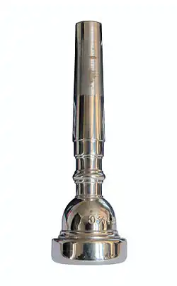 The mouthpiece on brass instruments is the part of the instrument placed on the player's lips. The mouthpiece is a circular opening enclosed by a rim and leads to the instrument via a semi-spherical or conical cavity called the cup. From the cup, a smaller opening (the throat) leads into a tapered cylindrical passage called the backbore. The backbore is housed in a tapered shank, which is inserted into an opening called the receiver on the main body of the instrument.