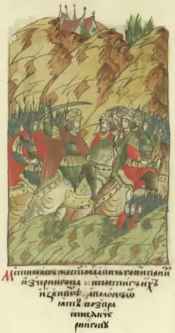 ![]() Mstislav in battle, miniature from the Illustrated Chronicle of Ivan the Terrible (16th century)]] | |