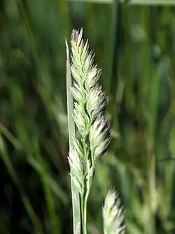 This plant is a rhizomatous perennial grass with usually erect, branching stems up to 1.3 meters tall. The flat leaves are up to 18 centimeters long. The inflorescence is a narrow panicle up to 16 centimeters long.[1][2]