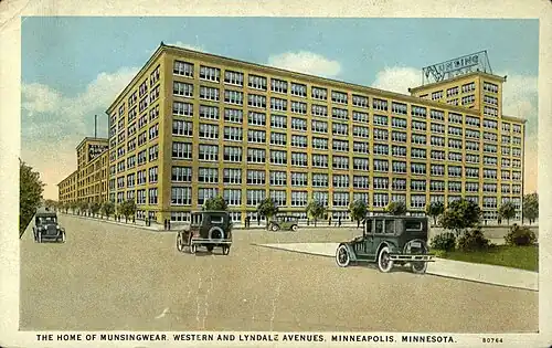 Munsingwear was the largest employer of women in the state of Minnesota; at one point, 85% of its 3,000 employees were women.[13] By the 1920s, in part trying to avoid unionization, Munsingwear offered many benefits, some quite progressive for the time. It had a health clinic staffed by a full-time nurse, with regular visits from general practitioners, otolaryngologists (because of air quality problems), dental assistants, and dentists. All of this care was free.[14] Munsingwear also offered access to health insurance; a branch of the Minneapolis Public Library, which circulated 7,500 books a year; a large, fully staffed kitchen, which provided lunches to the entire work force (in shifts);[15] an orchestra, which performed during Thursday lunch breaks; an on-site gymnasium; sports teams;[16] and other benefits.[2][17][18]