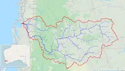 The river is one of the few major rivers close to Perth which is devoid of dams for public water supply. It includes a catchment area including a large part of the wheatbelt and southwest of the state, draining from 450 mm (18 in) per annum average rainfall country in the east near Pingelly, westward through the high rainfall parts of the Darling Range around Dwellingup with an average rainfall of 1,300 mm (51 in) per annum.