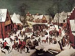 The Massacre of the Innocents is a copy by Pieter Bruegel the Younger (1565–1636) of his father's original dated to 1565–7 (illustrated). The museum acquired it in 1830. The scene depicted, again in a wintry Flemish landscape, is recounted in Matthew 2:16–18: Herod the Great, when told that a king would be born to the Jews, ordered the Magi to alert him when the king was found. The Magi, warned by an angel, did not and so, "When Herod realized that he had been outwitted by the Magi, he was furious, and he gave orders to kill all the boys in Bethlehem and its vicinity who were two years old and under." In relation to the Census painting then we can see why the children of Auden's poem "did not specially want it [the miraculous birth] to happen."