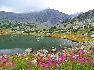 The first lake is the highest in the group and is also called the Icy Lake. Situated in a small cirque at 365 m to the northeast of Mount Musala, the lake lies at an altitude of 2,709 m, which makes it the highest one in the Rila and on the Balkan peninsula. It has an area of 1.8 ha and a depth of 16.4 m, which makes it the third largest and deepest of the group.[1] Its shape is oval, slightly elongated; the slopes are steep and covered with scree. The highest water temperature during the summer reaches 7.8 °C on the surface, and decreases to 5.1 °C in depth.[2]