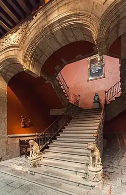 During the colonial period, this palace was considered one of the most sumptuous in New Spain.[2] The structure covers 2,762 m2, has a masonry foundation, thick masonry walls, and the facade covered in tezontle.[3][8] The main entrance and portal are done in cantera, a grayish-white stone, as well as the central balcony.[3][5] There are also friezes on the facade done in basalt.[8] The Baroque portal rests on four clawed feet and mascarons.[1][3] It also has cannon-shaped gargoyles, which could be fired, but only with permission of city authorities.[1] The look that survives today is the result of remodeling work done in the late 18th century and was one of the last major Baroque projects in Mexico. One of the building's most distinctive elements is the previously mentioned Aztec serpent's head, which was probably uncovered during this work. It is thought that the head may have come from the Templo Mayor and was placed as the cornerstone of the original house that was owned by Juan Gutierrez Altamirano.[3]