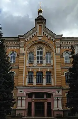 The museum building was constructed at the behest of Governor-General N. A. Kryzhanovsky[28] of the Orenburg Province. It was built on the site of the former Forstadtskaya (or Voiskovaya) Square for the Orenburg Theological Seminary. The seminary's main building was constructed in the Russian-Byzantine style with the participation of F. D. Markelov,[29] the diocesan architect of the Orenburg diocese. The technical and construction committee of the Ministry of Internal Affairs drew up the building's project, which was approved by the Minister General of the Cavalry Alexander Timashev. The building was completed on 11 January 1883, after the rejection of a project developed in Orenburg in 1876. On 24 August 1884, Bishop Veniamin of Orenburg consecrated the seminary and its church, which had been opened the previous year.[28]