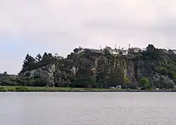 The northern side of the Musselburgh Rise is skirted by another main thoroughfare, Portobello Road. This road joins with the southern end of Portsmouth Drive close to the northeastern point of the rise, and continues across the causeway at Andersons Bay Inlet, though the junction is a limited one, and traffic may not turn right from the Musselburgh part of Portsmouth Drive to continue across the causeway. Close to the junction is a large memorial stone to the Taranaki Māori prisoners of the New Zealand Wars who were transported south to Dunedin, many of whom constructed the causeway and much of Dunedin's foreshore roads as forced labour.[5] A branch railway ran along Portobello Road in this area from the 1870s until 1912, and rail links continued to the suburb until the track were lifted in 1928.[6]