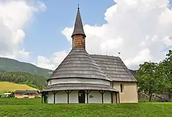 The parish church in the settlement is dedicated to Saint Margaret (Slovene: sveta Marjeta) and belongs to the Roman Catholic Archdiocese of Maribor. It was first mentioned in written documents dating to 1349. In the 17th century it was extended and widened.[8] There are two other churches in Muta. The church dedicated to John the Baptist in the hamlet of Spodnja Muta in the settlement is an 11th-century Romanesque rotunda with an Early Gothic sanctuary added. Fourteenth-century wall paintings survive in the church and the wooden painted ceiling is from the late 16th and early 17th century.[9] The church on the bank of the Drava River in the south of the settlement is dedicated to Saint Peter and is a late Romanesque single-nave building from the 13th century with various alterations over the centuries.[10]