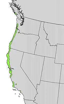 The species is native to the Pacific coast of North America, from Vancouver Island south to California as far south as the Long Beach area.[1]