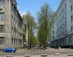 At the intersection of Myronosytska and Oles Honchar Streets stands the building of L. Hirshman's Ophthalmological Clinic, built in 1911–1912 in the Art Nouveau style.[27] A bit further, at 92 Myronosytska Street, is the former building of the Women’s Medical Courses (currently an academic building of the Technical University of Agriculture), constructed in 1914 based on the design by architect Oleksiy Beketov, a member of the Academy of Architecture.[28]