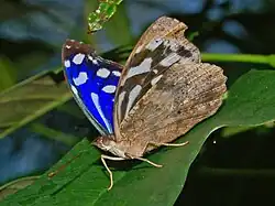 The length of the forewings reaches about 34–36 mm (1.3–1.4 in). The dorsal sides of the upper wings are bright blue with white transversal bands and white spots. The sapphire blue of the upper wings may appear black or neon blue depending on how the light is reflected. The undersides of the hindwings have a cryptic coloration, as they are mottled with different shades of color, varying from gray to brown, while the under sides of the forewings are black with white patches. The larvae feed on Dalechampia triphylla and Adelia triloba (family Euphorbiaceae). Adults usually feed on rotting fruit and animal dung.