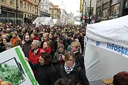 Národní street is a place where commemorative events and demonstrations associated with Velvet revolution are often held. This image is from a demonstration against Miloš Zeman during the 25th anniversary of the Velvet revolution.