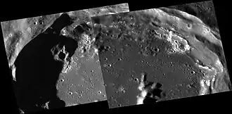 Nāwahī is a crater on Mercury. Nāwahī crater is located within the large Caloris basin, near the western rim. The unusual dark material creating a halo around Nāwahī makes this crater of special interest, as the dark material likely represents rocks with a different chemical and mineralogical composition than those of the neighboring surface.[1] The crater is named after Hawaiian patriot and painter Joseph Nāwahī.[2][3]