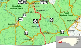 North Carolina Highway 107 (NC 107) is a primary state highway in the U.S. state of North Carolina. The highway runs north–south from the South Carolina state line, near Cashiers, to US 23 Business in Sylva.