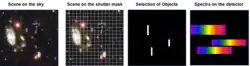 Multi-Object Spectroscopy (MOS) In MOS the total instrument field of view of 3 × 3 arcminutes is covered using 4 arrays of programmable slit masks. These programmable slit masks consist of 250 000 micro shutters where each can individually be programmed to 'open' or 'closed'. The contrast between an 'open' or 'closed' shutter is better than 1:2000.[7] If an object like e.g. a galaxy is placed into an 'open' shutter, the spectra of the light emitted by the object can be dispersed and imaged onto the detector plane. In this mode up to 100 objects can simultaneously be observed and the spectra be measured.
