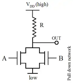 As an example, here is a NOR gate implemented in schematic NMOS. If either input A or input B is high (logic 1, = True), the respective MOS transistor acts as a very low resistance between the output and the negative supply, forcing the output to be low (logic 0, = False). When both A and B are high, both transistors are conductive, creating an even lower resistance path to ground. The only case where the output is high is when both transistors are off, which occurs only when both A and B are low, thus satisfying the truth table of a NOR gate: