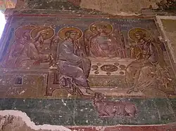 Church wall-painting was done in 1412–1431, stylistically it belongs to the wider circle of the Byzantine art.[1] Some compositions are relocated at the Art Museum of Georgia. The painting on the separating wall of the hall and after is with three registers: the argus – eye represented in the top register, Abraham's hospitability in the second, and church fathers and Svimeon Mesvete in the third.