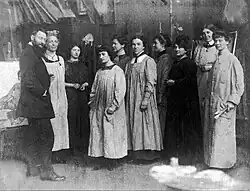 In the Sapozhnikova's studio, Fechin made carved furniture in a Neo-Russian style (most of the objects have not been preserved). Painter spent his time there every day; he wrote in this studio many of his famous works, such as "Portrait of Varya Adoratskaya" who was a niece of Sapozhnikova. As a painter, Nadezhda, in general, specialized on portraits, together with Fechin participating in the Kazan exhibitions.[1] In 1913, Sapozhnikova initiated the establishment of the handicraft industry museum industry dedicated to the Kazan provincial zemstvo. For this purpose, two students of the Tatar gymnasium of Aitova were sent to her studio.[8]