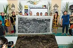 Launch of Big Stories Bongkud-Namaus (2016). Guests hold up a woodcut print by Pangrok Sulap produced in collaboration with the community.
