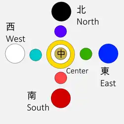 The names of the gods as given by the paintings correspond to a specific element within the full names given by the bon-puri.[12] They are written in red in Chinese characters, in upper left for the northern portraits and in upper right for the western ones.[22] All names are given in three characters with the final character being 位 wi "seat", so that the painting of the god Surang-sangtaeja-manora "Lord High Prince of the Spirit of Water" is simply titled 水靈位 Suryeong-wi "Seat of the Spirit of Water".[12]
