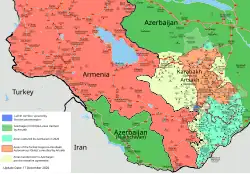 In late 2020, the large-scale Second Nagorno-Karabakh War resulted in thousands of casualties and a significant Azerbaijani victory. An armistice was established by a tripartite ceasefire agreement on 10 November, resulting in Azerbaijan regaining all of the occupied territories surrounding Nagorno-Karabakh as well as capturing one-third of Nagorno-Karabakh itself.[67] Ceasefire violations in Nagorno-Karabakh and on the Armenian–Azerbaijani border continued following the 2020 war. Between 2022 and 2023, Azerbaijan escalated its blockade of Nagorno-Karabakh using a military checkpoint, sabotaging civilian infrastructure,[68][69][70][71] and targeting agricultural workers.[72][73][74][75] The ten-month-long military siege isolated the region from the outside world.[76][77][78] In 2023, Azerbaijan launched a large-scale military offensive in September 2023,[79][80][81] resulting in the flight of most ethnic Armenians, the dissolution of Artsakh,[35][82] and its incorporation into Azerbaijan.