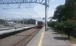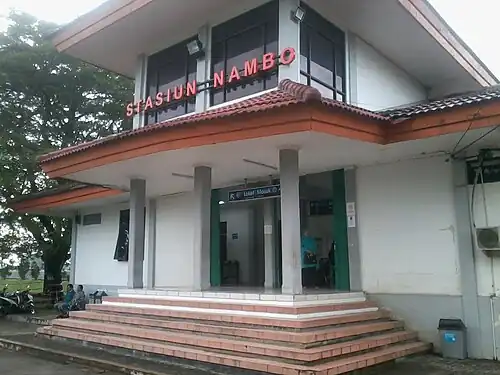 Nambo Station (NMO)[1] is a railway station located in Bantar Jati, Klapanunggal, Bogor Regency. Together with three other stations located on this line, it was only inaugurated in 1997, which makes it one of the newest station in the network. At the beginning, this line was planned to be incorporated into a larger circular line network, ranging from Cikarang, via Jonggol to Parung Panjang.[5] This plan had to be postponed due to the 1997 economic crisis.[4]
