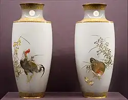 In 1896 he was appointed an Imperial Household Artist, one of only two cloisonné artists ever to receive this award, along with Namikawa Yasuyuki.[11][12] These artists were given a yearly stipend and were commissioned by the Imperial family to make presentation wares as gifts for foreign dignitaries. These would often bear the Imperial family crest, a sixteen-petaled chrysanthemum.[11] He seems to have been especially popular with the Imperial family, receiving many commissions.[13] In 1906–07 he made a series of thirty enamel plaques for the Akasaka Palace.[14][13] These oval medallions bear designs by Watanabe Seitei depicting flowers and birds of the four seasons.[15] His Imperial commissions also included a pair of vases that were presented to the British admiral Sir Nowell Salmon.[13]