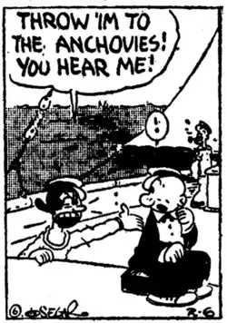 An early comic panel, prior to Olive and Popeye being established as lovers, in which Olive demands Castor throw Popeye overboard