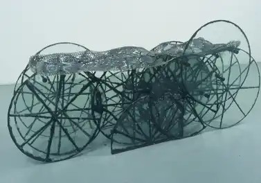 In exhibitions at Kouros Gallery (1998, 2004), Cohen presented enigmatic found-object and assemblage works (e.g., Gurney, 2002). The earlier show evoked feminine themes, using domestic items (silverware, kitchen utensils, broken glassware) that were partially concealed by taut Abacá ovals evoking protective sheaths and wombs (e.g., Distention, 1998).[3][43] New Art Examiner reviewer Rachel Selekman observed "strength of form and fragility of means imbue Cohen's sculpture with a presence of gritty elegance that breathes with life."[3] The scavenged-object sculptures in the latter show were compared to biomorphic combinations encountered along an urban beach offering "a tenuous balance of whimsy and thoughtfulness."[7]